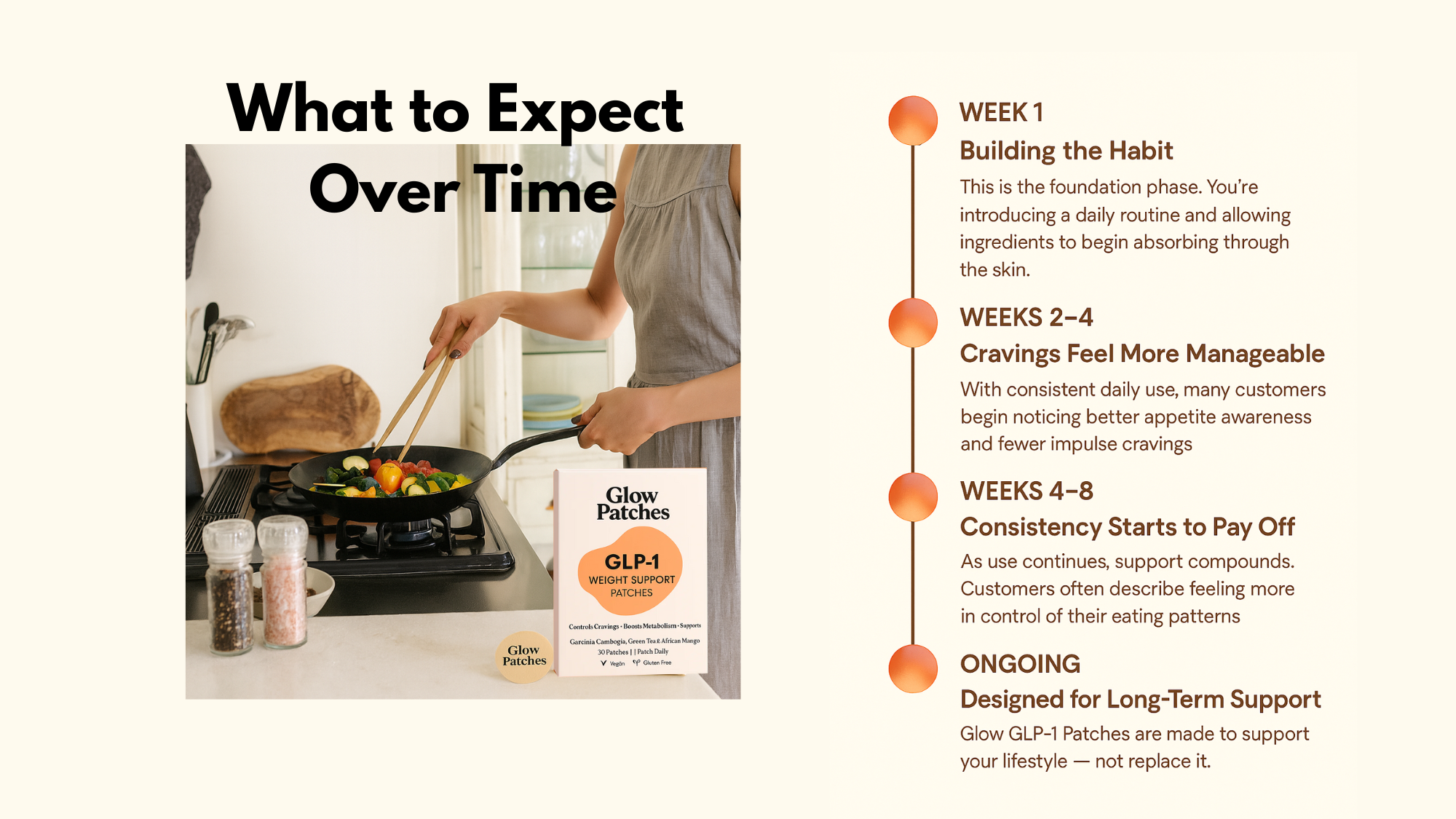 Glow GLP-1 Support Patches are designed to support your body’s natural appetite-regulation pathways, helping promote mindful eating, reduce everyday cravings, and support metabolic balance. Using a simple daily transdermal patch, this gentle, non-stimulant formula fits seamlessly into your routine—so you can feel more in control, consistent, and balanced throughout the day.