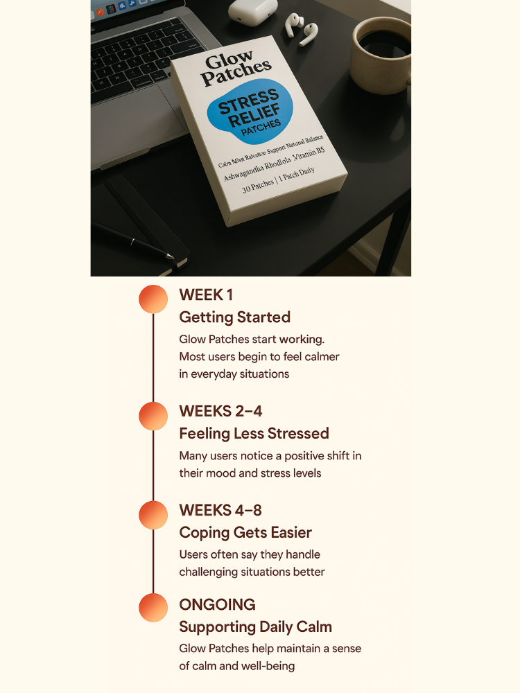 Glow Stress Relief Patches support a calm, balanced mind using plant-based ingredients delivered gradually through the skin.